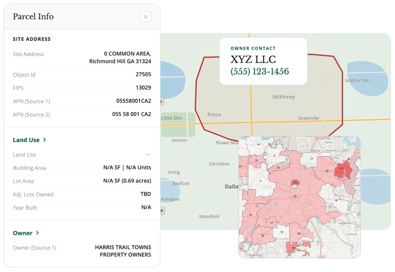 Produce a list of land owners to mail or call with skip tracing