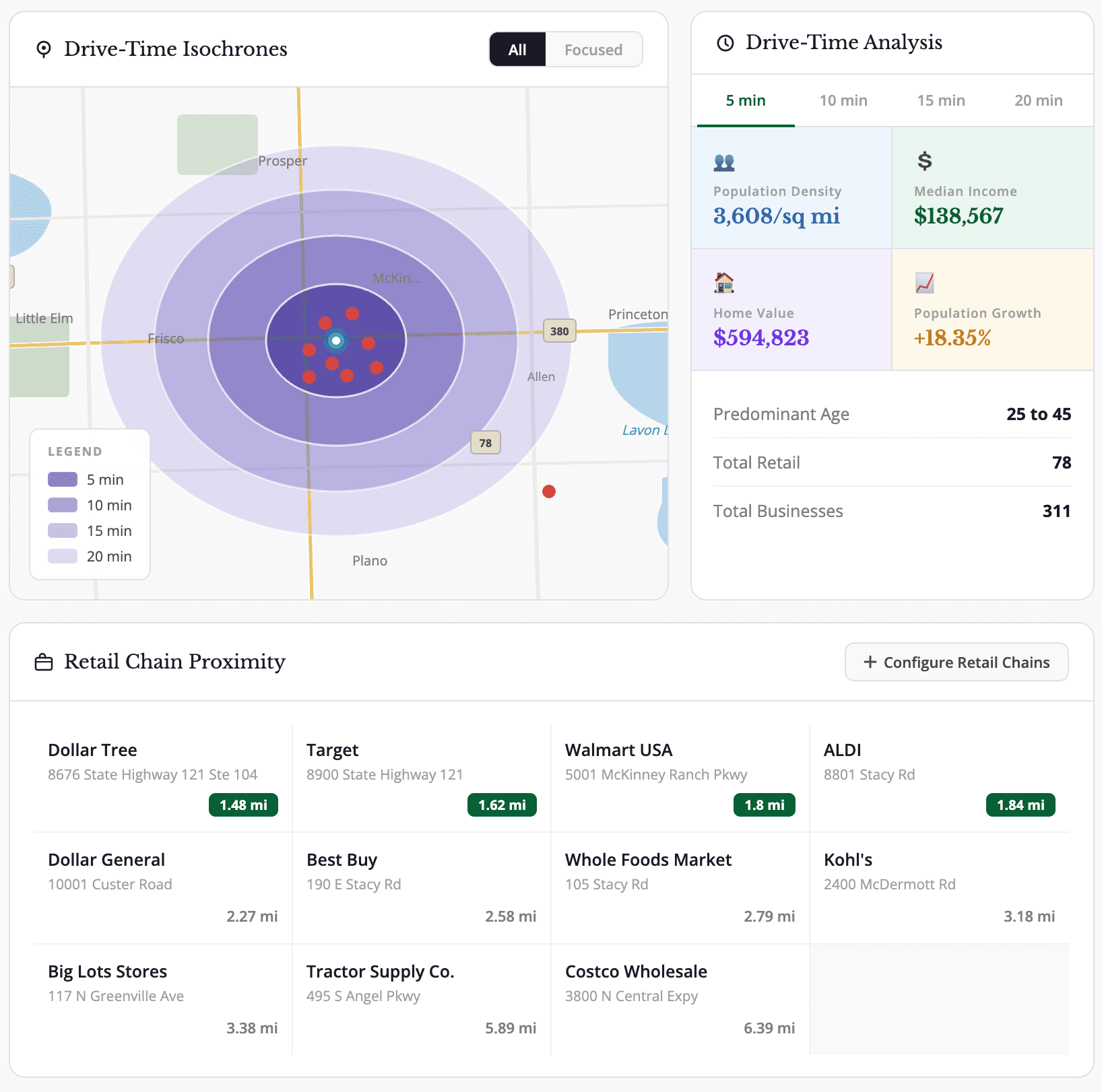 Filter for size, school scores, achievable rent and sales prices, flood zone percentage, zoning, slope and aspect, key retailers, major nearby builders and more!