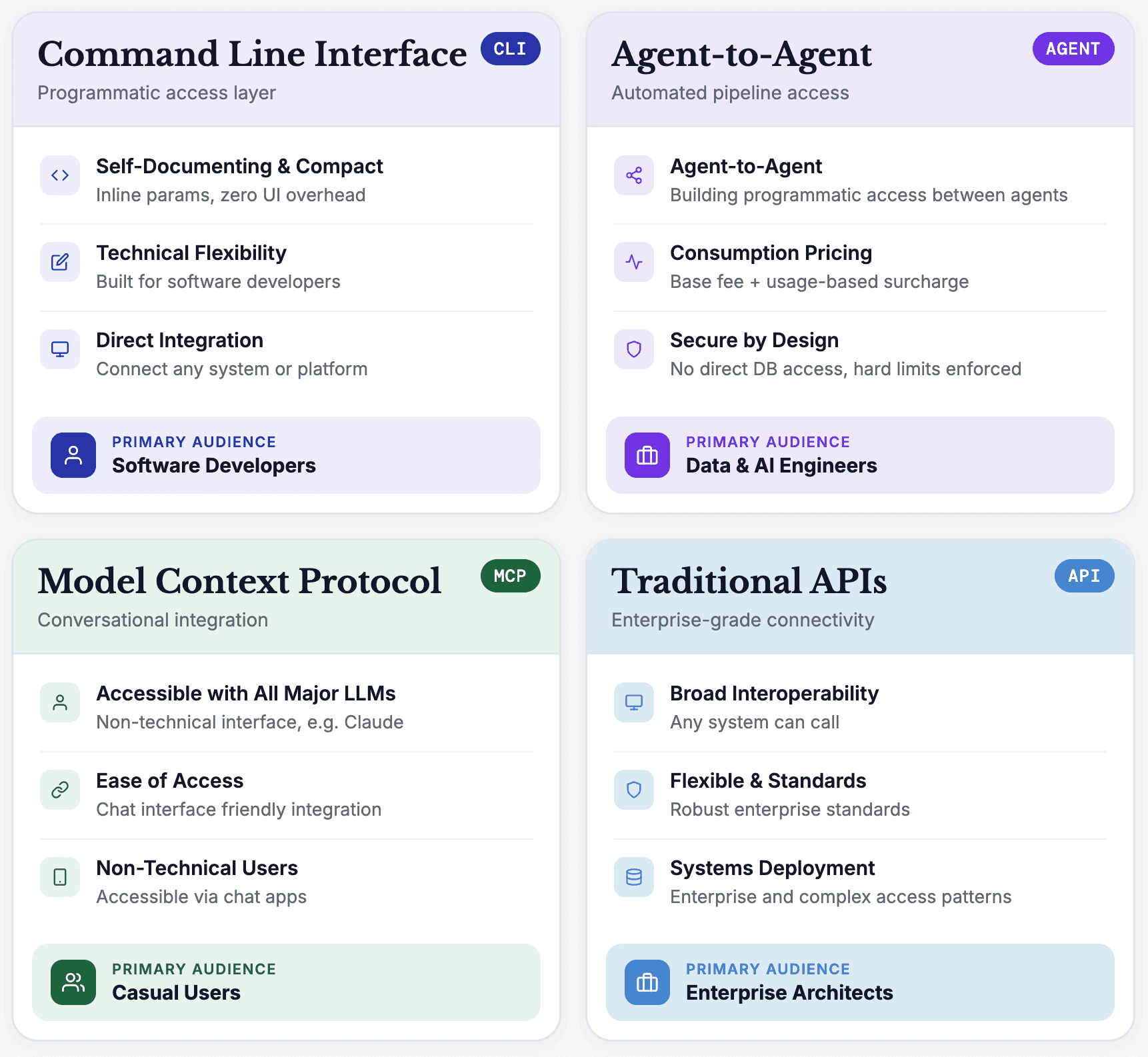 CLI: Purpose-built for AI agents — self-documenting, compact, and the fastest path from query to data