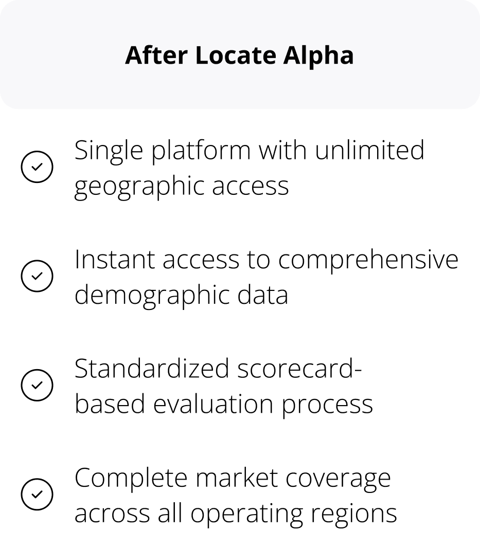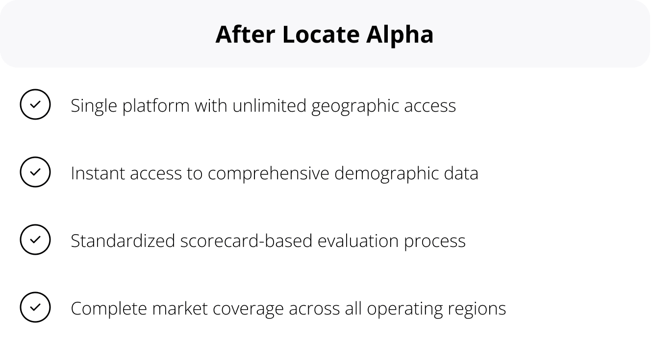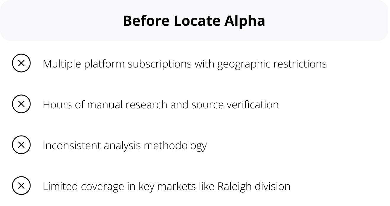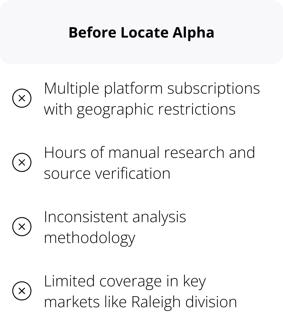 Quality Assurance: Leadership regularly asks, "Have you checked this out on Locate Alpha?" when reviewing deals, making Locate Alpha the gold standard for market validation.